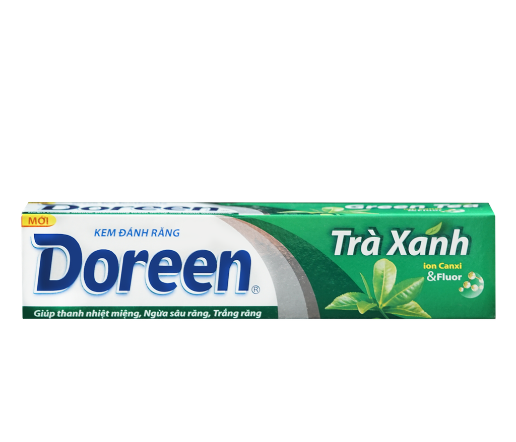 | Ưu điểm | Kem đánh răng Doreen Trà Xanh có tác dụng làm giảm bớt hiện tượng nhiệt trong cơ thể đồng thời làm săn chắc niêm mạc. Cung cấp ion Canxi và Fluor đầy đủ giúp làm khỏe men răng, phòng ngừa sâu răng mạnh mẽ và trắng răng. |